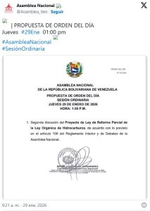 La Asamblea Nacional (AN) convocó a la plenaria este jueves 29 de enero para abordar en segunda discusión el proyecto de reforma parcial de la Ley de Hidrocarburos, como punto único de la sesión.